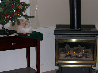 I'm including a picture of Tut by the little stove in the living room, where he found a cozy spot under our tiny tree (the large one's in the family room). Doesn't he look comfy?