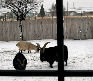 Our backyard with neighboring goats that visit